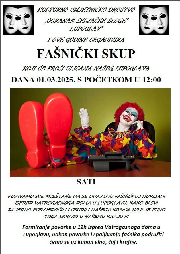 Već tradicionalno, u subotu uoči fašnika, u Lupoglavu je održana fašnička povorka u koju su se uključili članovi ovdašnjih udruga na čelu s Ogrankom Seljačke sloge.