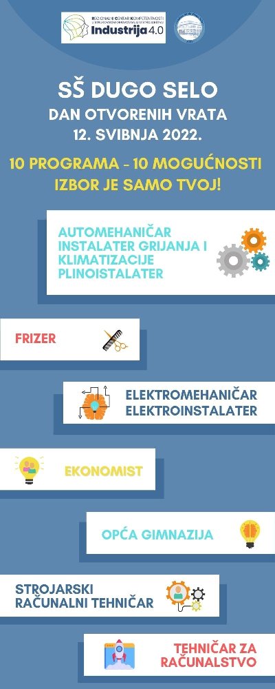 Srednja škola Dugo Selo otvara svoja vrata učenicima osnovnih škola i njihovim roditeljima ovog četvrtka, 12. svibnja. Dođite i upoznajte naše nastavnike i učenike, istražite programe, pogledajte naše učionice i uključite se u zabavne radionice!
