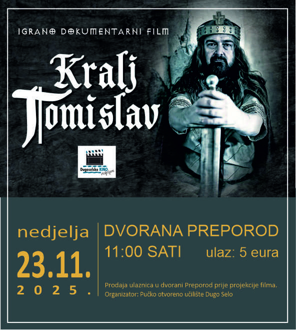 Pučko otvoreno učilište Dugo Selo poziva vas na projekciju igrano-dokumentarnog filma „Kralj Tomislav“ u nedjelju, 23. studenoga, u 11:00 sati u dvorani Preporod.