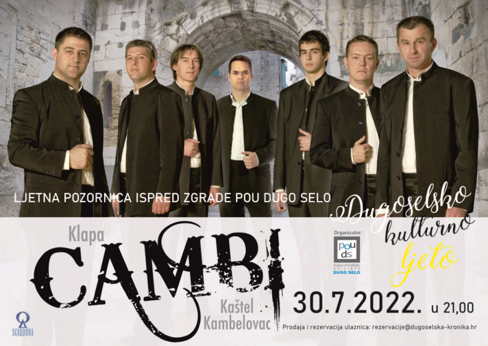 Pučko otvoreno učilište Dugo Selo odlučilo je za kraj Dugoselskog kulturnog ljeta obradovati svoje posjetitelje te će prepoloviti cijenu ulaznice za koncert Klape Cambi koji se održava 30. srpnja s početkom u 21,00 sat, na otvorenoj pozornici pored zgrade Pučkkog učilišta u Dugom Selu. Umjesto, najavljenih 80,00 kuna, cijena ulaznice za koncert Klape Cambi, iznosit će 40,00 kuna.
