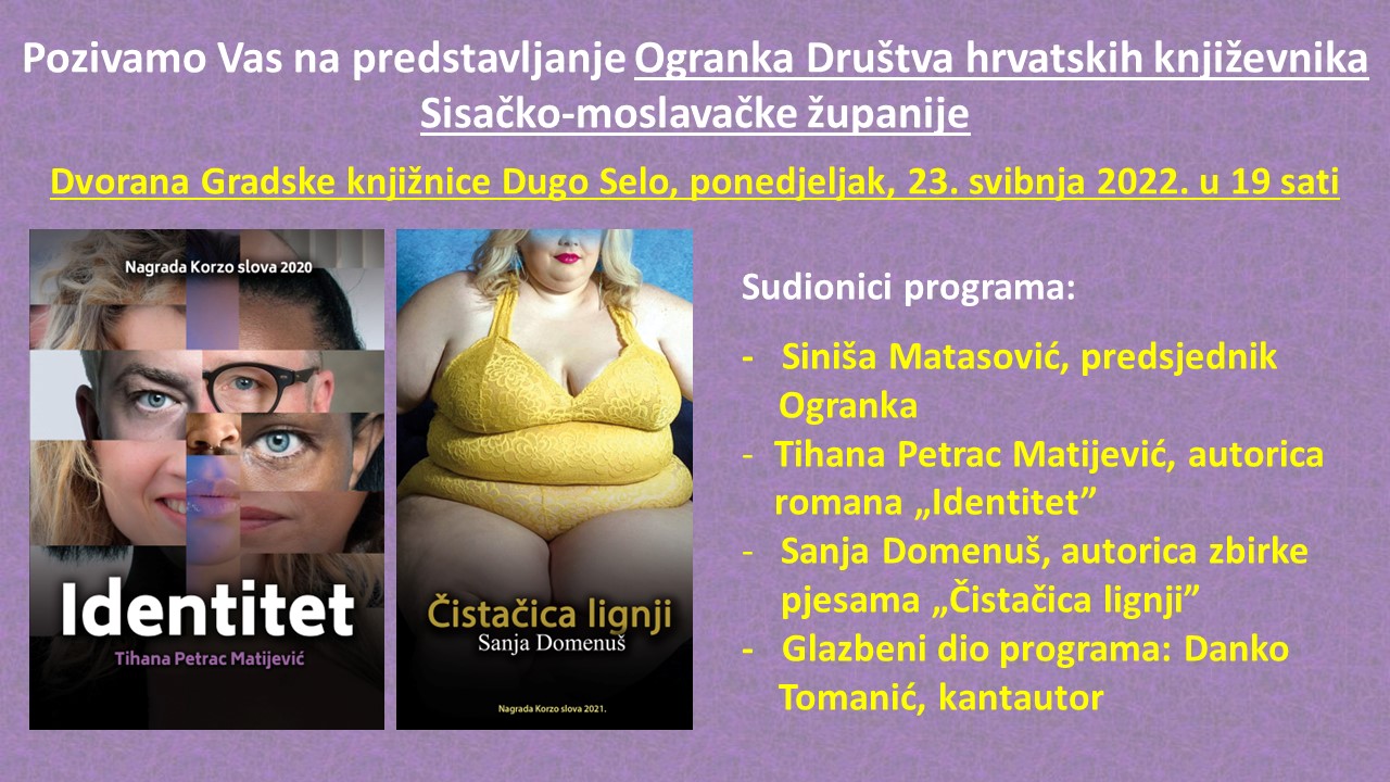 Dođite i upoznajte rad ovog mladog Ogranka Društva hrvatskih književnika u ponedjeljak 23. svibnja 2022. u 19 sati. Priredba će se održati u dvorani Gradske knjižnice Dugo Selo.