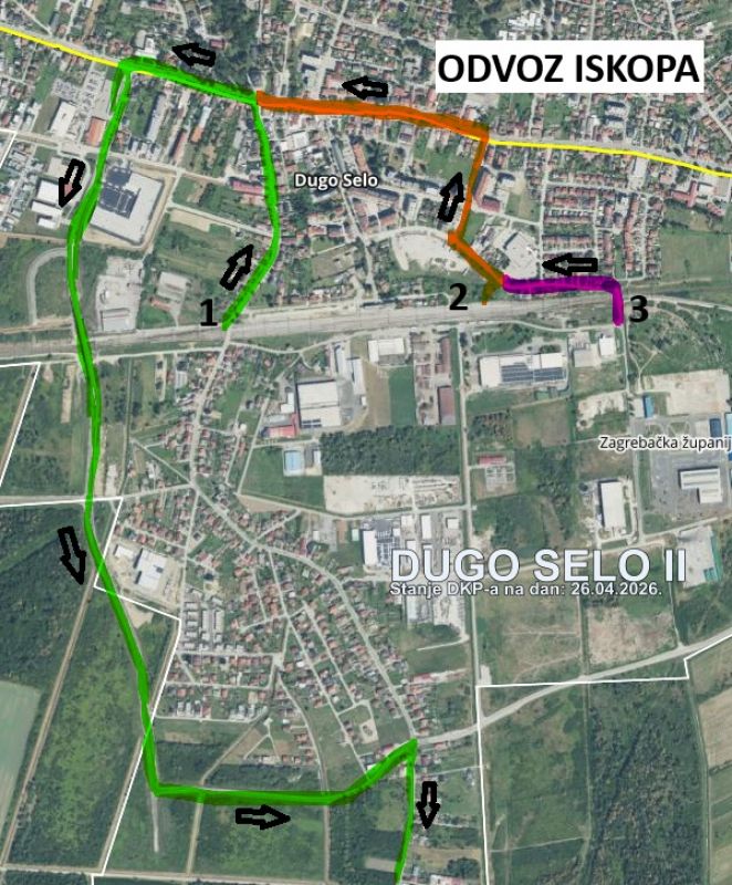 Izvođač radova na izgradnji željezničkog kolodvora u Dugom Selu uvodi kamionski prijevoz za potrebne radove, odnosno za dovoz i odvoz kamenog materijala i iskopa te je osigurao čišćenje prometnica čistilicom tijekom kamionskog prijevoza za potrebe izvođenja radova.