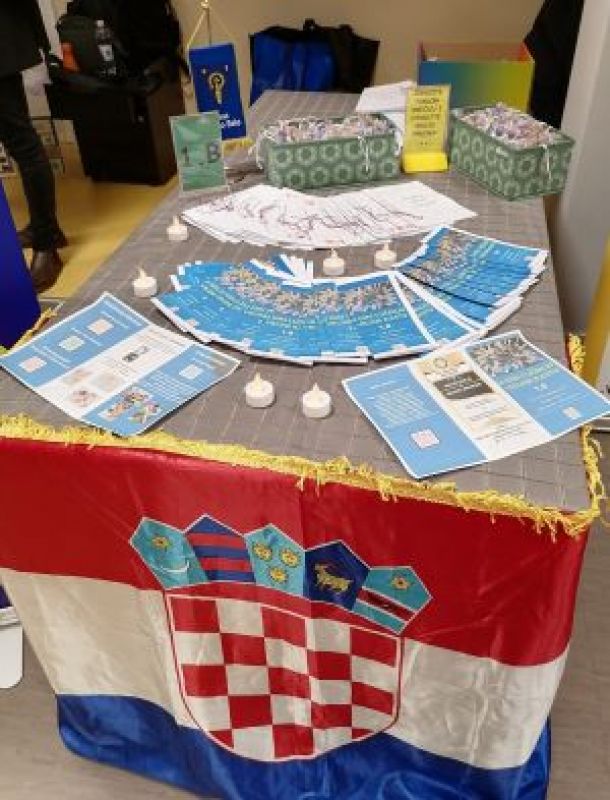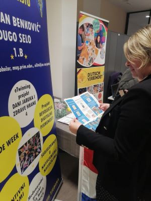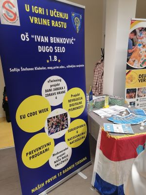 Na promotivnom plakatu je istaknut već u potpunosti realiziran međunarodni projekt poput „Dana jabuka i zdrave hrane“ koji promiče zdrave životne navike, istaknut je i započet međunarodni projekt „Naša mala knjižnica“ koji traje do lipnja iduće godine i koji potiče čitalačke navike i kreativnost kod djece te je istaknut i nacionalni projekt „Revolucija digitalne pismenosti“ usmjeren na razvijanje ključnih digitalnih vještina. Učenici 1.b aktivno su već sudjelovali i u natječajima na školskoj i državnoj razini. Svim navedenim i provedenim aktivnostima se osigurava sveobuhvatan razvoj učenika. U razgovoru sa zainteresiranim posjetiteljima učiteljica Sofija Štefanac Klobučar posebno je naglasila važnost digitalne pismenosti koja se razvija kroz inicijative poput EU Code Weeka i sličnih međunarodnih projekata, a suradničko učenje i timski rad temelj su brojnih školskih aktivnosti pa ovakvi projekti učenicima pružaju priliku za stjecanje vještina potrebnih u modernom društvu. Promotivni plakat i izložbeni stol su dodatno uljepšale dekoracije s nacionalnim simbolima i kreativnim detaljima čime se promovirao i identitet škole i grada, a i učiteljičin ponos na ostvarene rezultate. Učiteljica Sofija Štefanac Klobučar je dobitnica priznanja Najbolji nastavnik na prošloj, Šestoj međunarodnoj konferenciji koja se održala proljetos u Banja Luci.