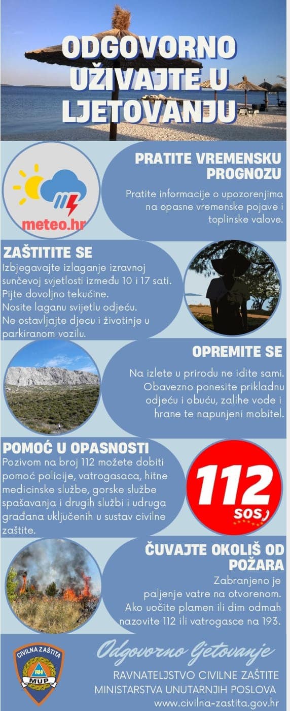 Preporuke Ravnateljstva civilne zaštite RH za sigurno ljetovanje Detalji Zagrebačka županija 04 Srpanj 2023 670 Ravnateljstvo civilne zaštite RH dalo je preporuke za sigurno ljetovanje. Sve možete pročitati u LETAK: ODGOVORNO LJETOVANJE hrv / eng