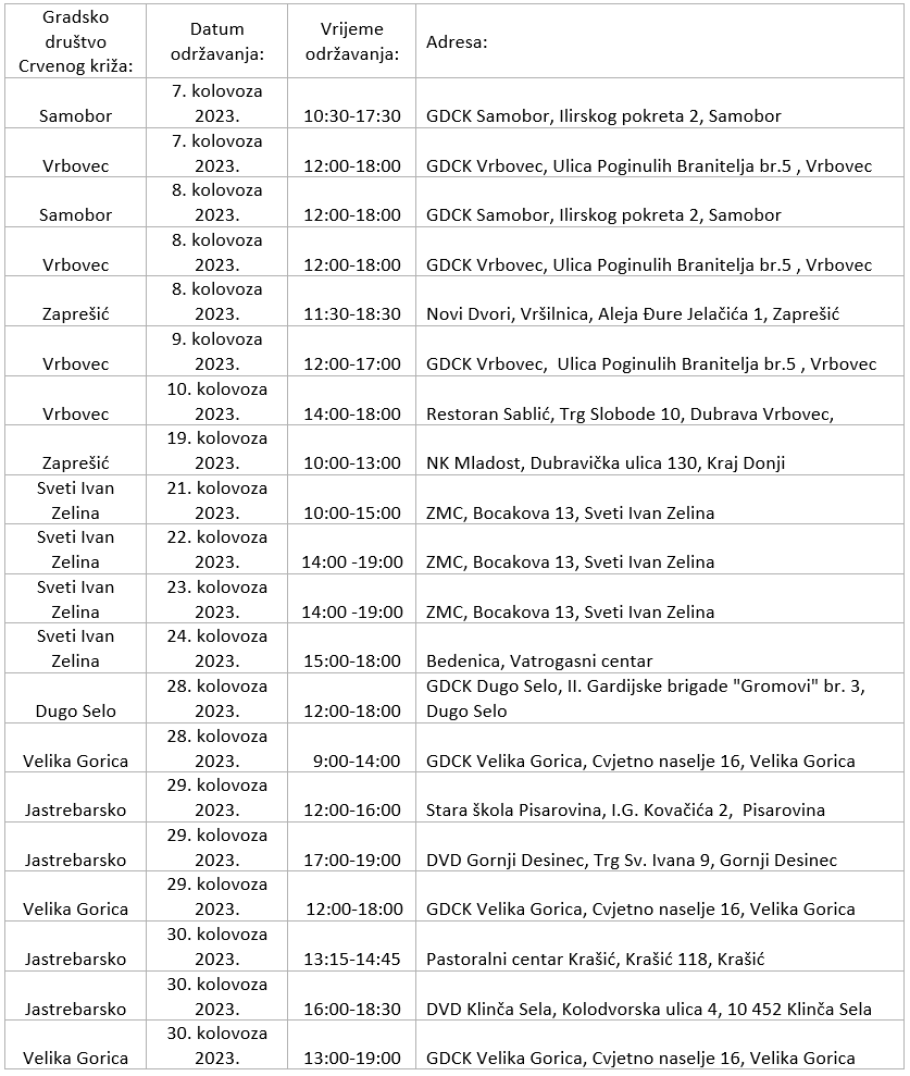 Društva Crvenog križa Zagrebačke županije tijekom kolovoza provodit će redovite akcije dobrovoljnog darivanja krvi na više lokacija.