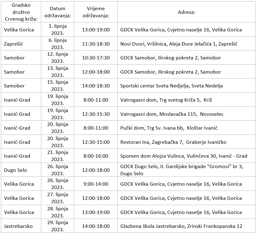 Društva Crvenog križa Zagrebačke županije tijekom lipnja provodit će redovite akcije dobrovoljnog darivanja krvi na više lokacija.
