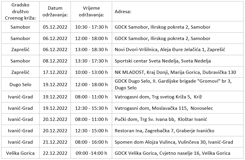 Društva Crvenog križa Zagrebačke županije tijekom prosinca provodit će redovite akcije dobrovoljnog darivanja krvi na više lokacija.