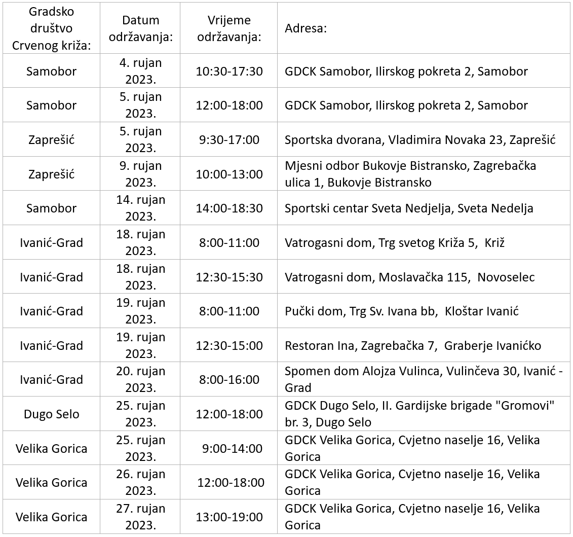 Društva Crvenog križa Zagrebačke županije tijekom rujna provodit će redovite akcije dobrovoljnog darivanja krvi na više lokacija. U Dugom Selu akcija će se održati 25.rujna od 12 do 18 sati.