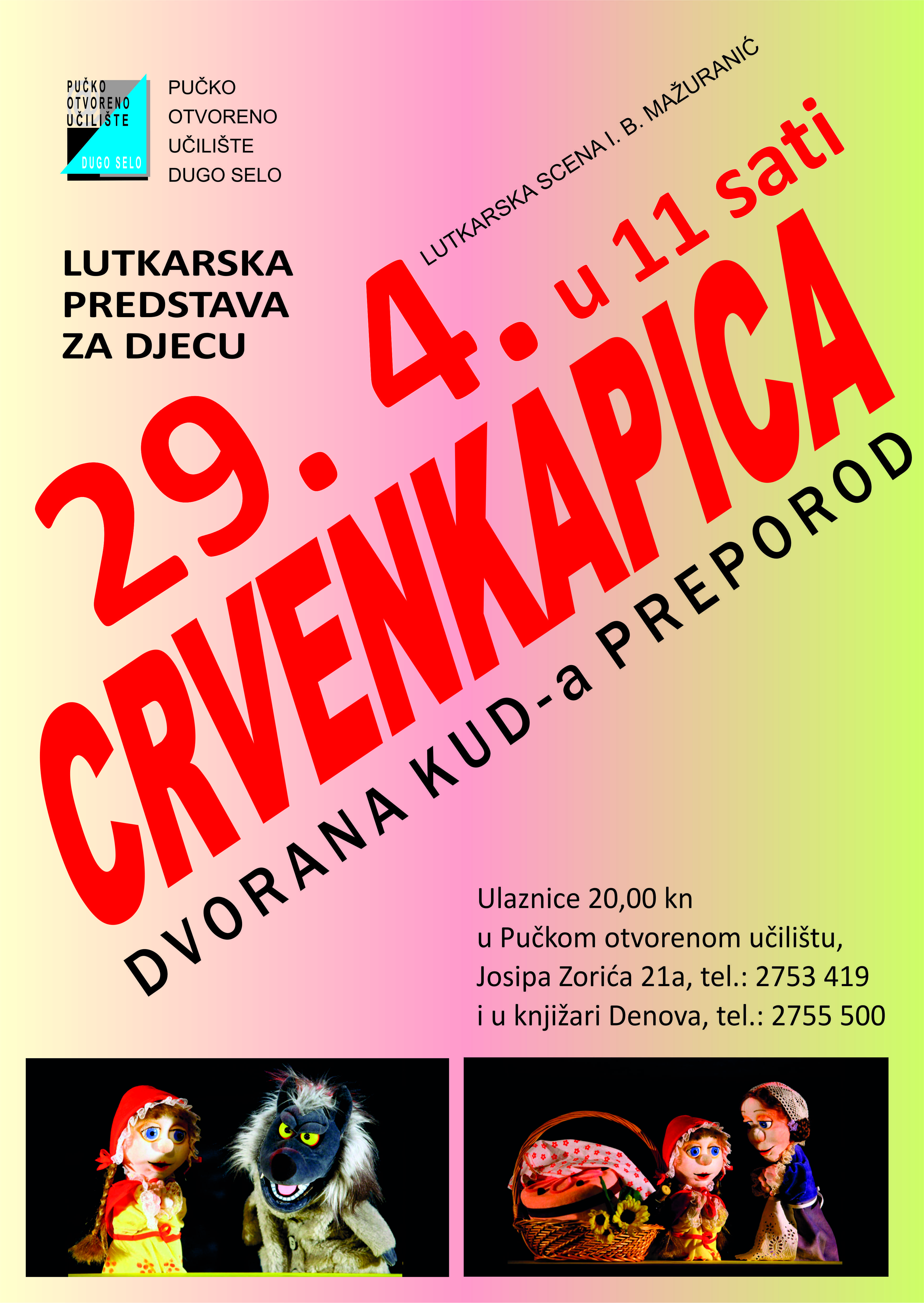 Naša najmlađa dugoselska publika moći će sljedeće subote, 29. travnja, uživati u još jednoj lutkarskoj predstavi, svim poznatoj bajci braće Grimm – Crvenkapici. U organizaciji Pučkog otvorenog učilišta Dugo Selo, predstava će se održati u Dvorani KUD-a Preporod, s početkom u 11,00 sati.