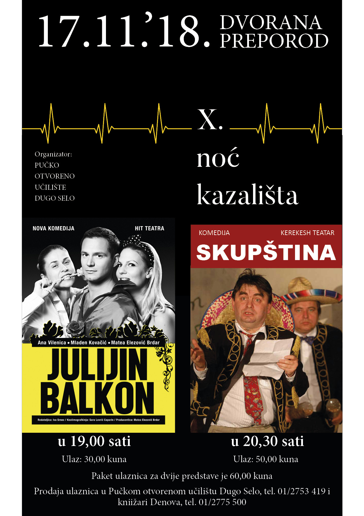 Pučko otvoreno učilište Dugo Selo uključuje se treću godinu za redom u Noć kazališta. Dugoselska kazališna publika moći će, u subotu 17.studenoga u dvorani Preporod, pogledati dvije predstave.