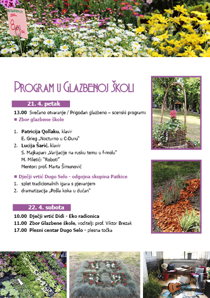 Na svečanom otvorenju nastupit će Glazbena škola Dugo Selo i Dječji vrtić Dugo Selo. Posjetitelje očekuje velik izbor sadnica sezonskog cvijeća i drugog biljnog materijala te raznih ukrasnih predmeta i suvenira. U Perivoju grofa Draškovića može se razgledati vrtna izložba. Pripremljen je i glazbeno-scenski program, satnicu donosimo u nastavku.