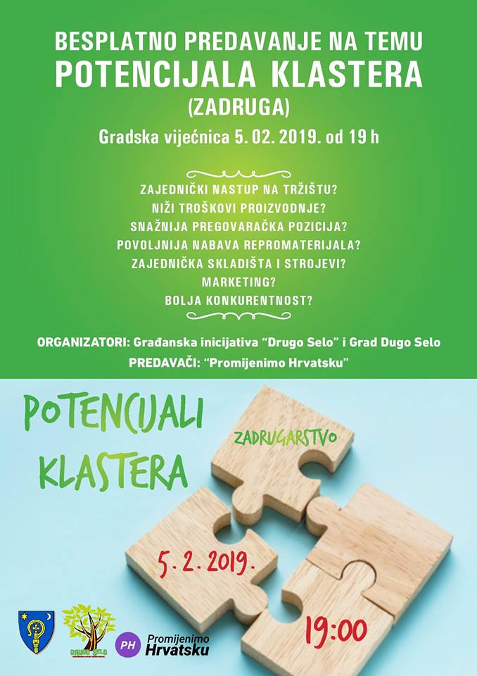 U organizaciji Građanske inicijative Drugo Selo i Grada Dugog Sela održat će se besplatno predavanje na temu klastera (zadruga) u utorak, 5. veljače, od 19:00 sati u prostorijama Gradske vijećnice Grada Dugog Sela. Gosti predavači iz stranke Promjenimo Hrvatsku će izlagati na temu mogućeg zajedničkog nastupanja na tržištu, bolje konkurentnosti, nižih troškova proizvodnje poslovnih subjekata kroz udruživanje na principima klastera (zadruga).