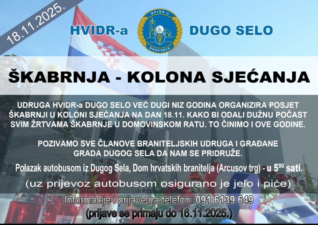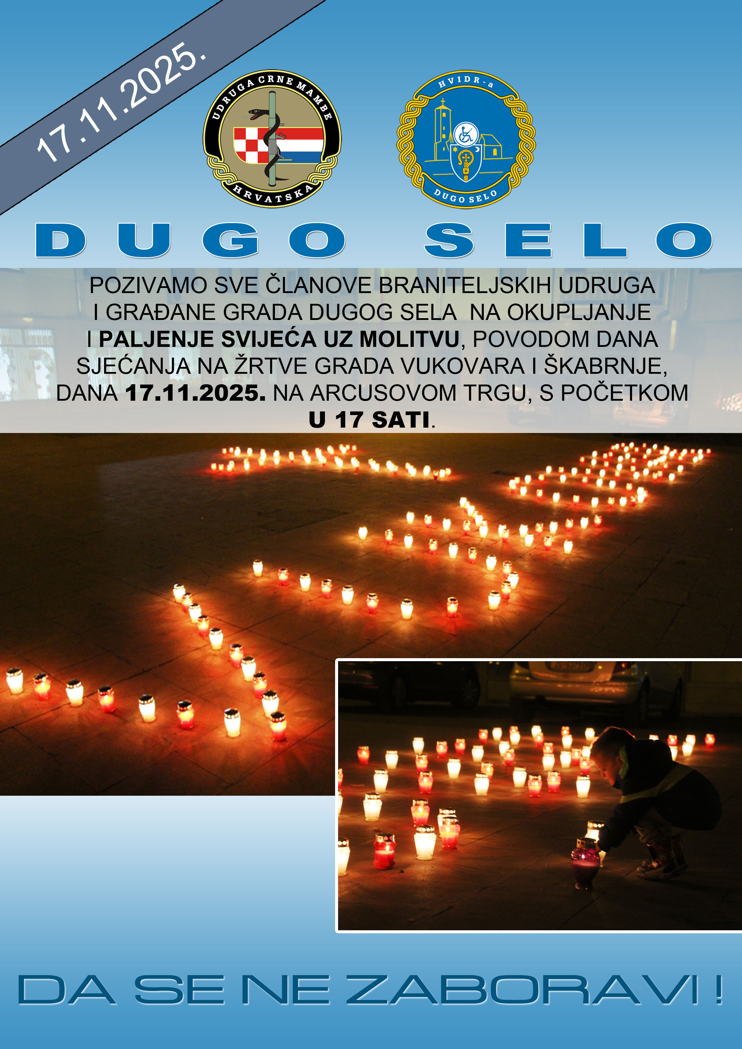 Braniteljske udruge iz Dugog Sela i ove godine aktivno organiziraju dostojanstveno odavanje počasti žrtvama Domovinskog rata od paljenja svijeća, molitve i odavanja počasti na Arcusovom Trgu i polaganja vijenaca i svijeća na spomenicima hrvatskim braniteljima u Dugom Selu. Povodom Dana sjećanja na žrtvu Vukovara i Šakrnje 18.11. organiziraju prijevoz autobusom u Vukovar i Škabrnju, mjesta su gotovo popunjena, za Vukovar još ima mjesta. Prijave su do 16.11.