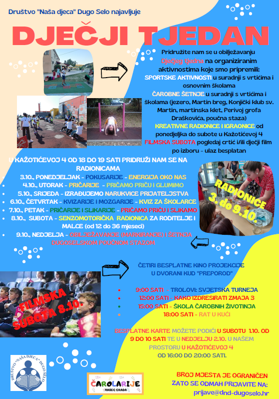 Društvo „Naša djeca“ Dugo Selo je ove godine pripremilo razne aktivnosti u nadolazećem Dječjem tjednu koji počinje u ponedjeljak 3.10. i završava u nedjelju 9.10.2022. godine Dječji tjedan je tradicionalna godišnja akcija Saveza društava “Naša djeca” Hrvatske i osnovnih društava te aktivnost posve posvećena djeci.