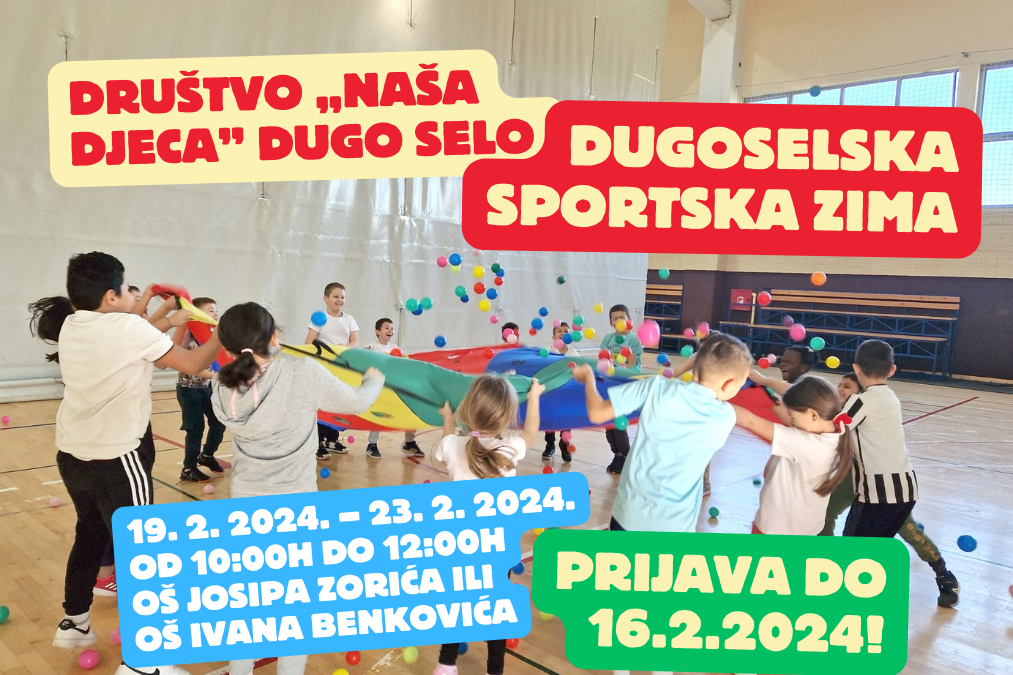 Društvo "Naša djeca" Dugo Selo" organizira besplatne sportske aktivnosti za učenike od 1. do 8. razreda koje će se održavati od 19. do 23. veljače 2024. u vremenu od 10 do 12 sati.