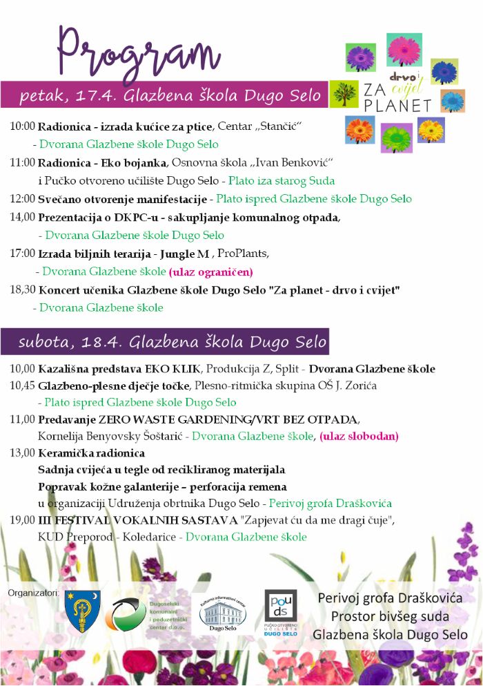 Dugo Selo ovog je vikenda središte hortikulture i ekologije. U Perivoju grofa Draškovića i okolnim gradskim lokacijama otvorena je tradicionalna manifestacija „Za planet – drvo i cvijet“ koja tijekom dva dana donosi bogat program posvećen uređenju okućnica, održivom vrtlarstvu i podizanju ekološke svijesti, a povodom Dana planeta Zemlje 22.travnja.