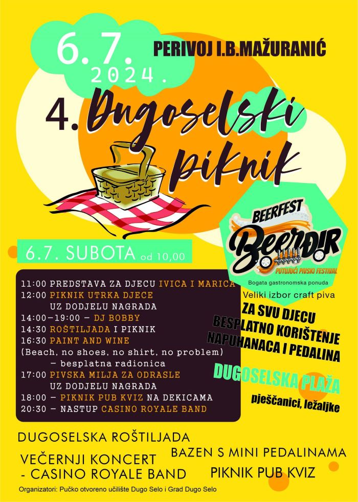 Subotu 6. srpnja u Dugom Selu rezervirajte za najljepši, najzabavniji i najfiniji piknik u gradu - 4. Dugoselski piknik, u organizaciji POU-a Dugo Selo, pod pokroviteljstvom Grada Dugog Sela. Pod krošnjama prekrasnog Perivoja Ivane Brlić Mažuranić sve Dugoselce i njihove drage goste očekuje omiljeno druženje na otvorenom.