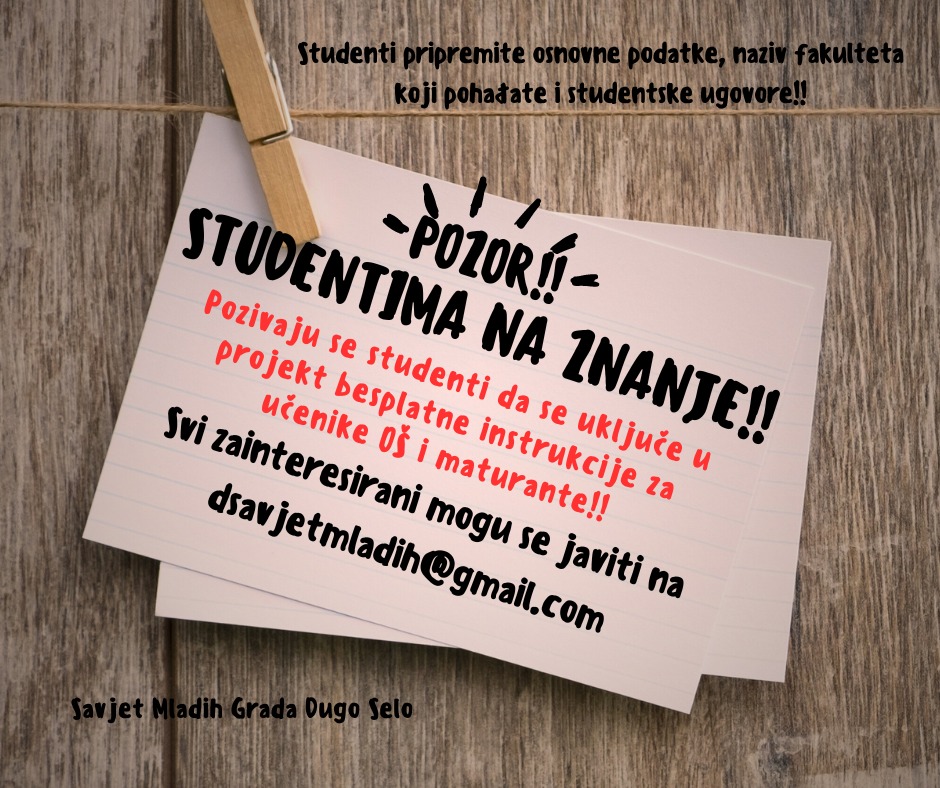 „U projektu ćete svojim mladim sugrađanima pomoći da što bolje savladaju potrebno gradivo. Iako u nazivu projekta stoji da su instrukcije i pripreme „besplatne“, vama će Grad Dugo Selo putem Studentskog servisa Sveučilišta u Zagrebu na žiro-račun uplatiti 10 eura neto po odrađenom satu.