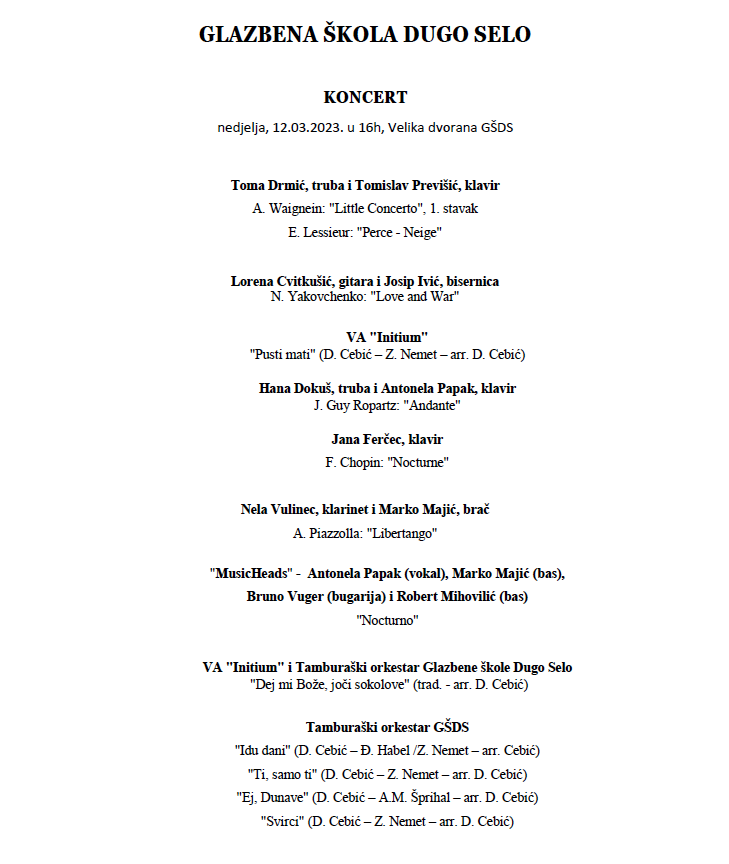 Dragi naši! Pozivamo vas na tradicionalni koncert na kojem ce nastupiti brojni solisti, zbor i Tamburaški orkestar Glazbene škole Dugo Selo.