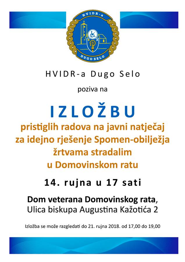 Otvorenje izložbe radova pristiglih na javni natječaj za idejno rješenje Spomen obilježja žrtvama stradalim u Domovinskom ratu održat će se 14. rujna 17 sati u Domu veterana Domovinskog rata, ulica biskupa Augustina Kažotića 2.