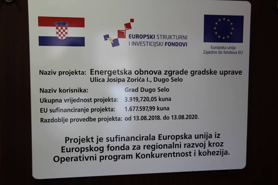 Ugovor o izvođenju radova na energetskoj obnovi zgrade dugoselske gradske uprave potpisali su danas u Maloj vijećnici gradonačelnik Nenad Panian i predstavnici tvrtke NEVING d.o.o. iz Zagreba. Projekt se sufinancira sredstvima Europske unije, iz Europskog fonda za regionalni razvoj kroz Operativni program konkurentnost i kohezija. Ukupna vrijednost projekta je 3.919.720,05 kuna, a EU sufinanciranje iznosi 1.677.597,99 kuna. Radovi na energetskoj obnovi vanjske ovojnice objekta će započeti 1. travnja, planirano trajanje je 45 dana.