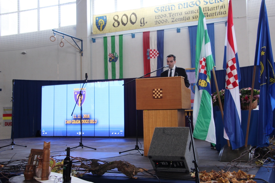Čestitavši Dan Grada i blagdan sv. Martina okupljenima se obratio predsjednik Gradskog vijeća Darjan Budimir, iz čijeg govora donosimo izvode. Podsjetio je na lanjsko obilježavanje 20-te obljetnice dobivanja statusa Grada te svih projekata koji su poboljšali uvjete života – izgradnja nove škole, Doma zdravlja, komunalne infrastrukture, izgradnje sustava odvodnje i pročistača otpadnih voda zajedno s Općinom Rugvica, sportskih sadržaja, kulturnih i drugih udruga, uspješnih učenika i studenta. Grad danas ima 20 000 stanovnika i u samom je vrhu u RH po vitalnom indeksu. Shodno tome, trećina se proračuna izdvaja za predškolski odgoj te među vodećima u državi. Dvije osnovne škole polazi 1600 učenika, preko 800 djece u Gradskim vrtiću i tri privatna, preko 500 mladih i uspješnih sportaša iz brojnih sportskih klubova, zavidne sportske infrastrukture. KUD „Preporod“ obilježio je 110. godina postojanja, „Dugoselska kronika“ 50 godina, Gradska knjižnica, međunarodno uspješna Glazbena škola Dugo Selo kao i brojne druge udruge, izdvojio je iz područja kulture. Vatrogasci djeluju u 6 DVD-a, prvaci su Hrvatske i županije, 6. na vatrogasnoj Olimpijadi, DVD Dugo Selo proslavio je 125 godina postojanja. Branitelji su okupljeni u udruge Crne mambe, HVIDR-u, Hrvatske vitezove.