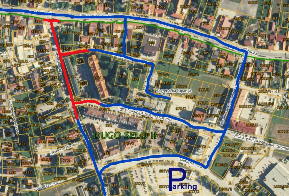 Prometna regulacija se organizira zbog održavanja turističko gastro-kulturne manifestacije "Stara jela z Dugog Sela". Promet dijelom Kolodvorske, Krležine i Kažotićeve (crveno) bit će zabranjen, dok su ostale ulice (plavo) prohodne. Parking za sve posjetitelje osiguran je u Sajmišnoj ulici na prostoru "starog sajmišta".