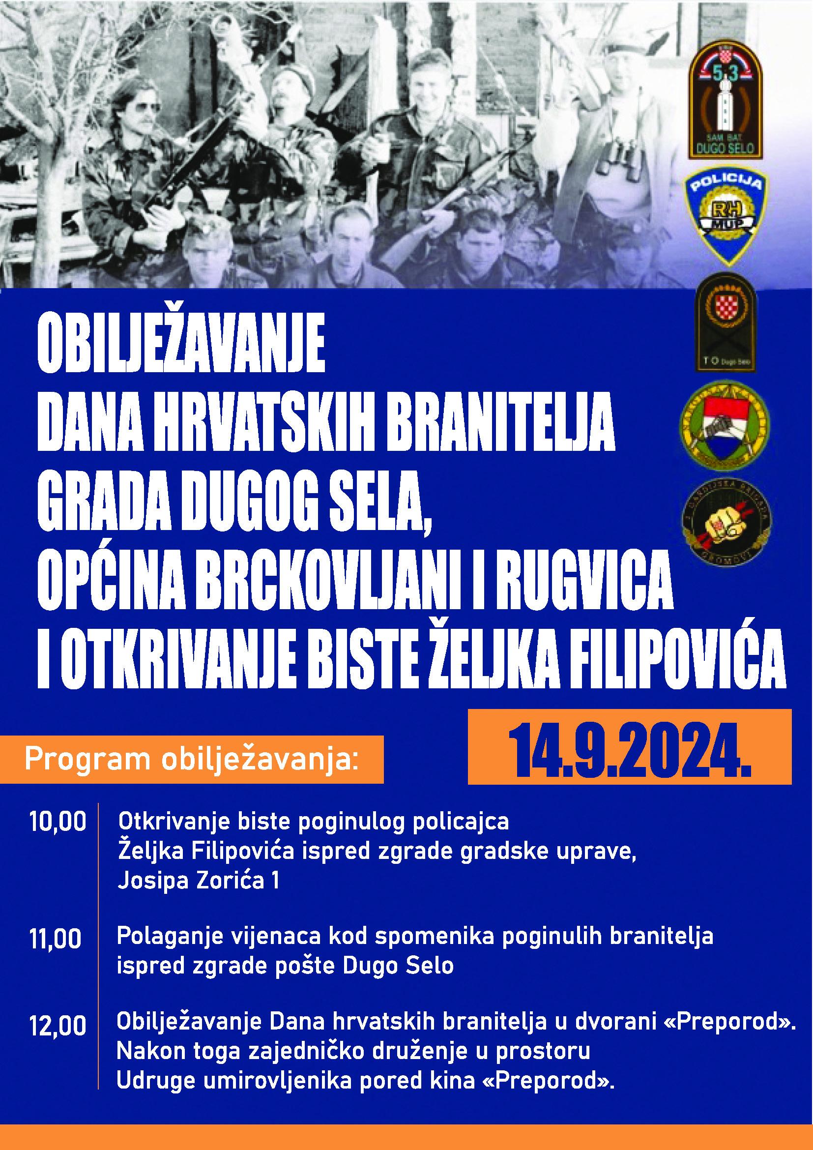 Ove subote u Dugom Selu će se održati prvo obilježavanje Dana hrvatskih branitelja grada Dugog Sela, općina Brckovljani i Rugvica uz otkrivanje biste dugoselskog poginulog policjaca Željka Filipovića ispred zgrade Gradske uprave Grada Dugog Sela.