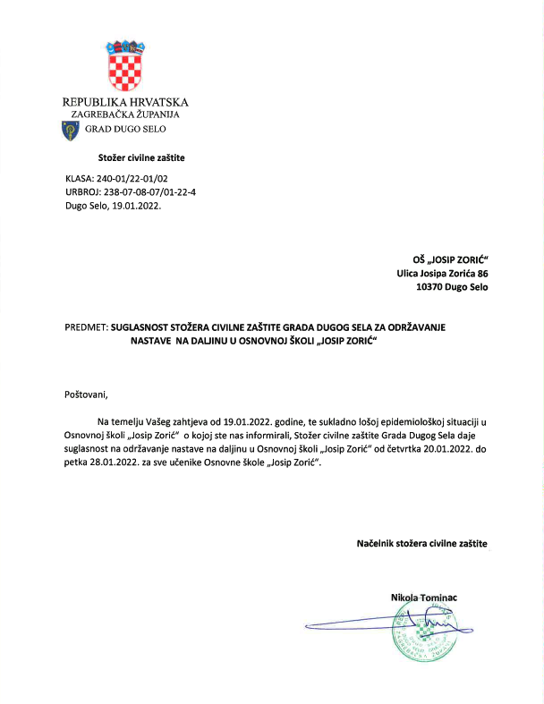 Stožer civilne zaštite Grada Dugog Sela na čelu s načelnikom Nikolom Tomincem s obzirom na pogoršanje epidemiološke slike dao je suglasnost spomenutim školama za organizaciju nastave prema modelu C i modelu B.