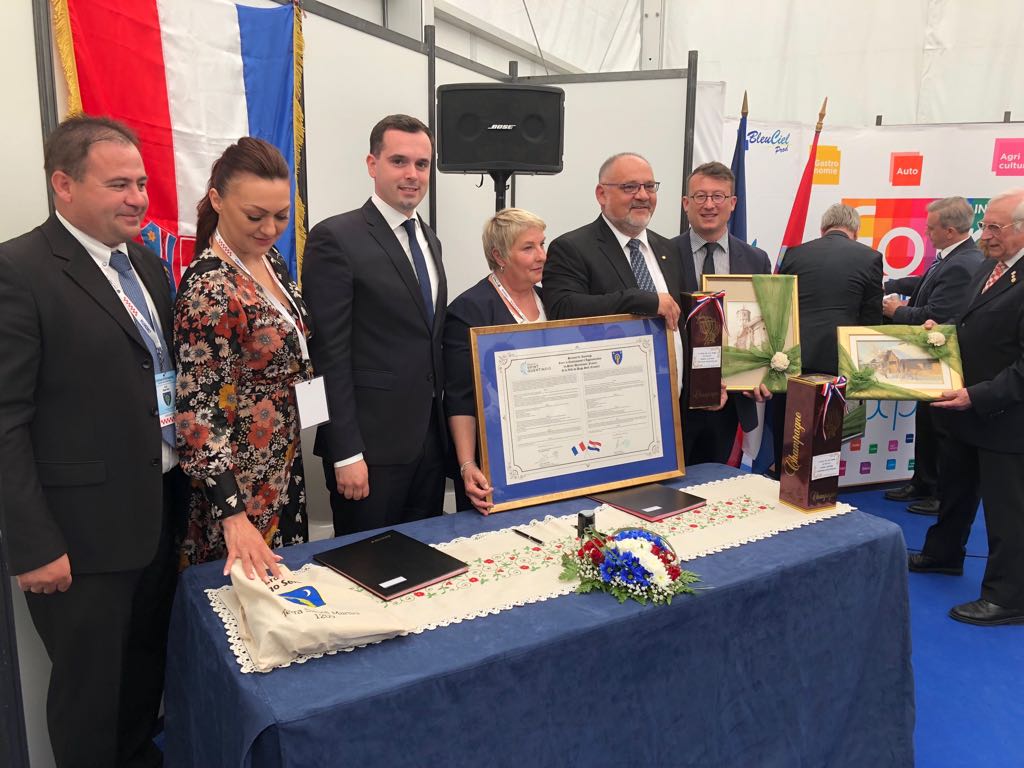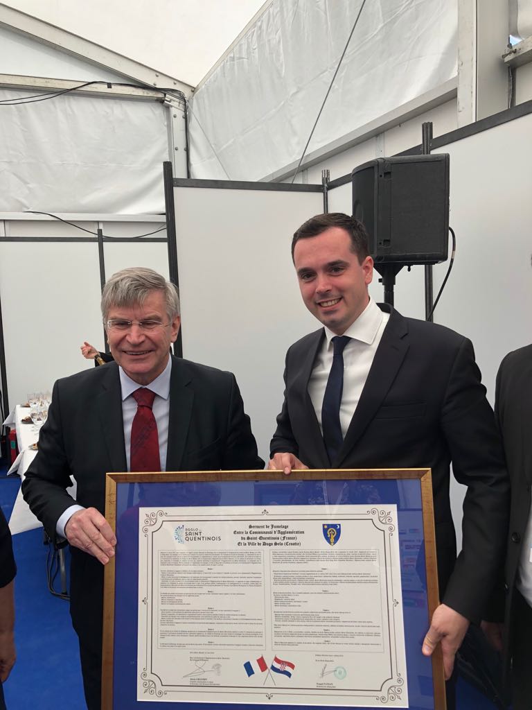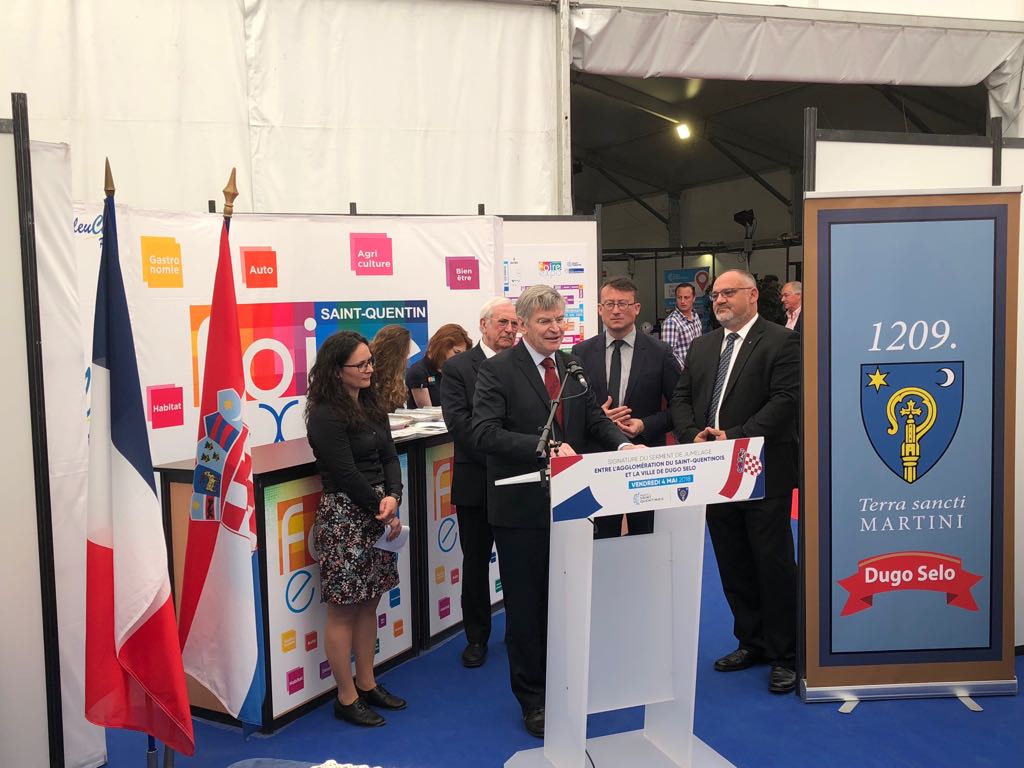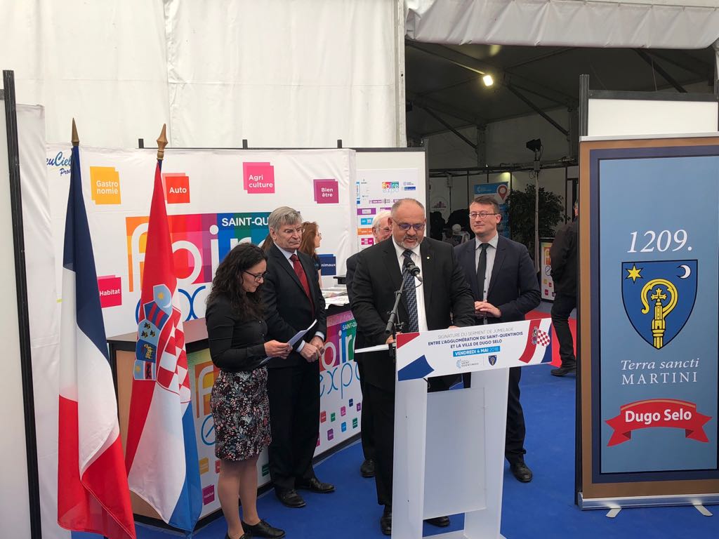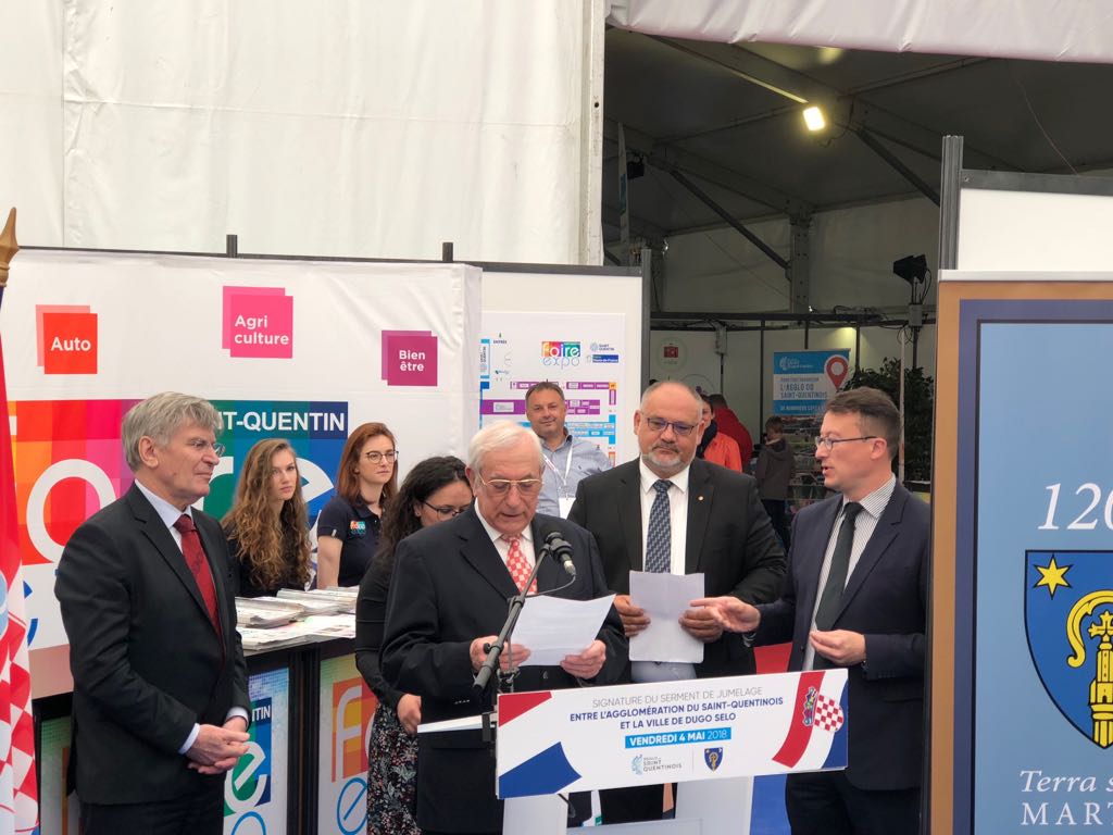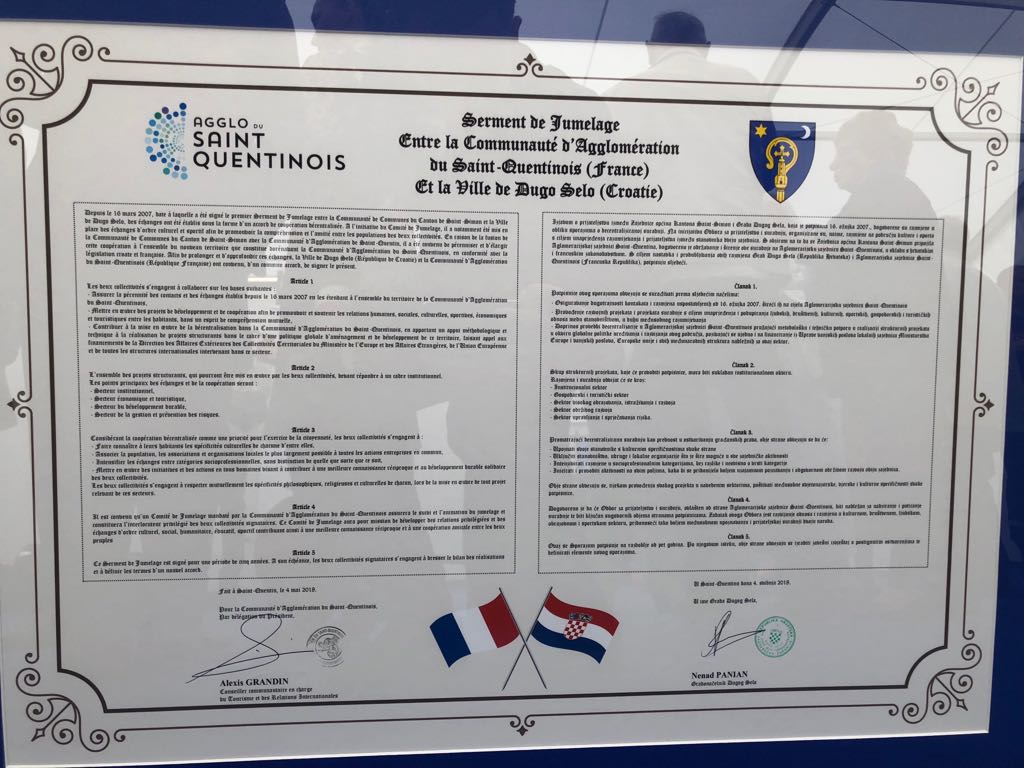 U sklopu Foire Exposition de St. Quentin, danas je održana svečanost potpisivanja novog Sporazuma o prijateljstvu i suradnji Grada Dugog Sela i Aglomeracijske zajednice Saint-Quentinois. Potpise na ugovor stavili su gradonačelnik Nenad Panian i izaslanik predsjednika Aglomeracijske zajednice Saint-Quentinois Xaviera Bertranda i aglomeracijski savjetnik za turizam i međunarodne odnose Alexis Grandin, nazočio je predsjednik Odbora za bratimljenje Jean - Marie Gondry. Potpisivanju je prisustvovao i veleposlanik RH u Francuskoj Filip Vučak, predstavnici domaćina, zamjenica gradonačelnika Jasminka Kokot Bambić, predsjednik Gradskog vijeća Darjan Budimir, vijećnici Vedrana Dragičević Borovec i Stjepan Štefinovec, direktor Sportskog centra Miroslav Škrlec, predstavnik Udruge pčelara „Maslačak“ Tomica Melić, profesori i učenici Glazbene škole Dugo Selo.