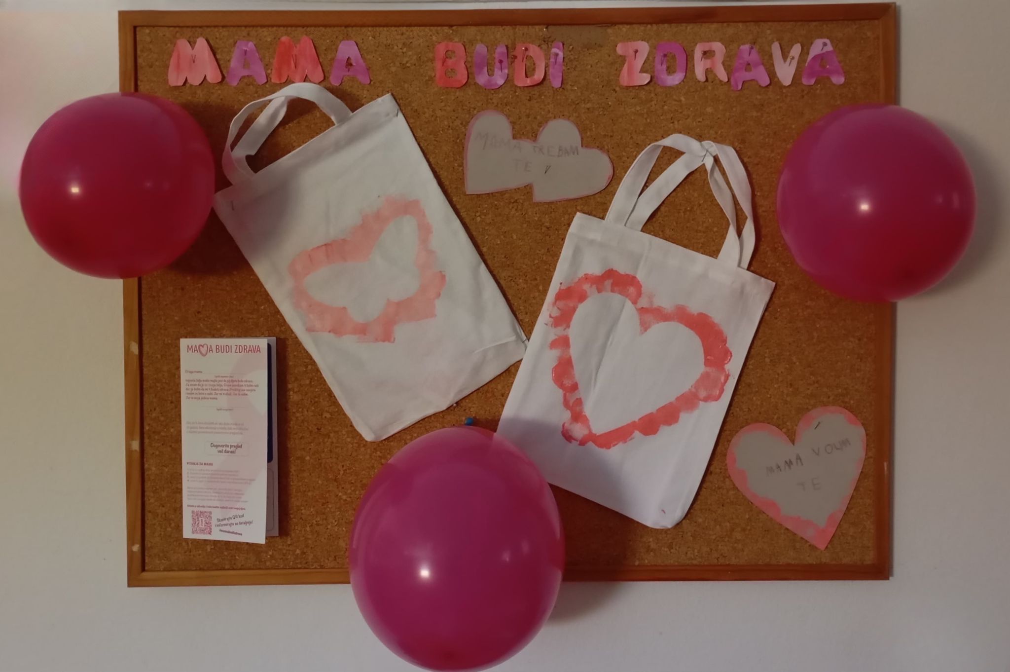 Jedna od aktivnosti bila je oslikavanje platnenih vrećica simbolima ljubavi i nježnosti. U vrećice smo stavili edukativni letak o brizi za vlastito zdravlje i porukom „MAMA, BUDI ZDRAVA“. Formirajući se u obliku srca sa ružičastim majicama i balonima poslali smo poruku svim majkama da brinu o sebi jer zdrava mama je naš osmijeh, ljubav i sreća.