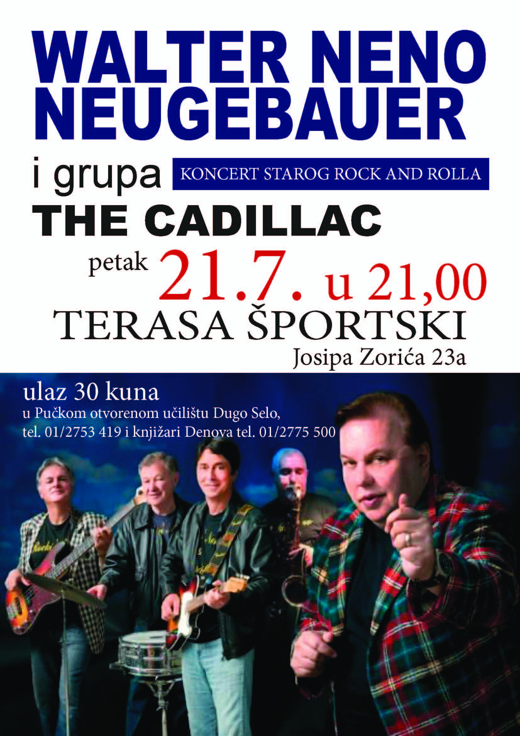 Ljetna pozornica u Športskom (Josipa Zorića 23a) ovaj petak, 21. srpnja, također s početkom u 21,00 sat, dočekuje nove goste. Završna večer KUŠ-a rezervirana je za ljubitelje rock and rolla, a gosti su okorjeli zagrebački roker Walter Neno Neugebauer i njegov band The Cadillac koji već pola stoljeća rasturaju zagrebačke plesne scene sa svojom svirkom. Stoga, uz uživanje u dobrom starom rock and rollu, Dugoselci će u petak moći i zaplesati i vratiti se u neka već pomalo zaboravljena vremena.