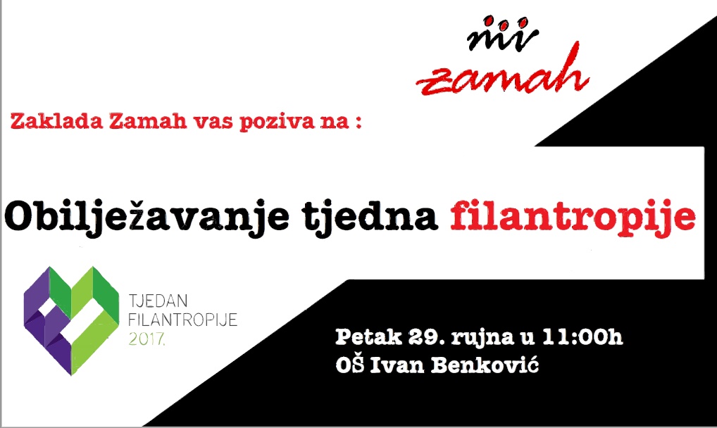 Tjedan filantropije u Osnovnoj školi Ivan Benković pod pokroviteljstvom Zaklade Zamah, održat će se u prostoriji školske knjižnice s početkom u 11 sati. Dnevni red programa čine priredba i najava Humanitarno sportsko-zabavnog događaja „Noina staza“; izložba likovnih radova na temu filantropije; kreativne radionice.