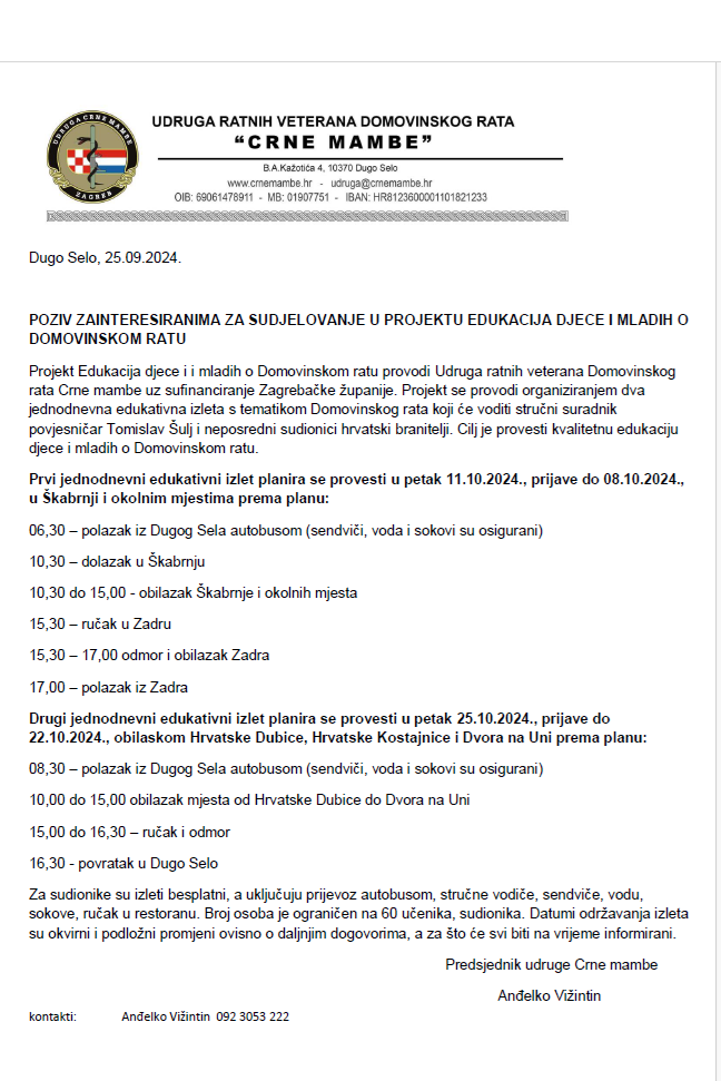 Udruga Crne mambe iz Dugog Sela provodi projekt edukacije djece i mladih o Domovinskom ratu, uz potporu Zagrebačke županije i Grada Dugog Sela.