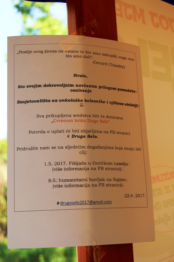 Akcija je u suradnji sa Crvenim križem Dugo Selo imala i humanitarni karakter. Zbog potrebe osnivanja Savjetovališta za onkološke bolesnike i njihove obitelji koje nedostaje našem gradu, na štandu u Perivoju grofova Drašković tijekom ove njihove subotnje akcije prikupljani su novčani prilozi. Savjetovalište bi bilo osnovano pri Crvenom križu Dugo Selo, tako da je sav prikupljen prihod, a radi se o 1.114,20 kuna, proslijeđen njima.