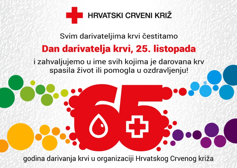 Hrvatski Crveni križ ove godine 25. listopada, na Dan dobrovoljnih davatelja krvi, obilježava 65 godina dobrovoljnog darivanja krvi u Hrvatskoj. Na taj je dan 1953. u Željezari Sisak provedena prva akcija dobrovoljnog davanja krvi u organizaciji Hrvatskog Crvenog križa. Ta akcija, kao i brojne koje su uslijedile nakon nje, bila je utemeljena na osnovnim načelima dobrovoljnog davanja krvi – daruj krv dobrovoljno, besplatno, solidarno i anonimno!
