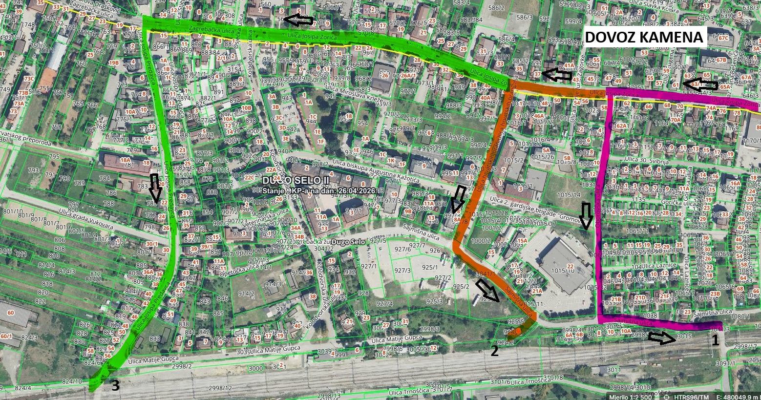 1. Ulica Josipa Predavca – Zagrebačka ulica - kružni tok – Ulica Anđelke i Belizara Božikovića – nadvožnjak – Rugvička ulica – k.č.br. 3126, 3123, 3116 k.o. Dugo Selo II