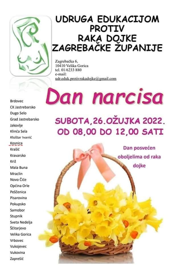 Crveni križ Dugo Selo ovim putem poziva sve građanke i građane da podrže tradicionalnu akciju "Dan narcisa" - humanitarna akcija namijenjena jačanju svijesti o prevenciji i ranom otkrivanju raka dojke te podršci svim oboljelima od ovog najčešćeg oblika zloćudne bolesti kod žena u Hrvatskoj i u većini zemalja u svijetu.