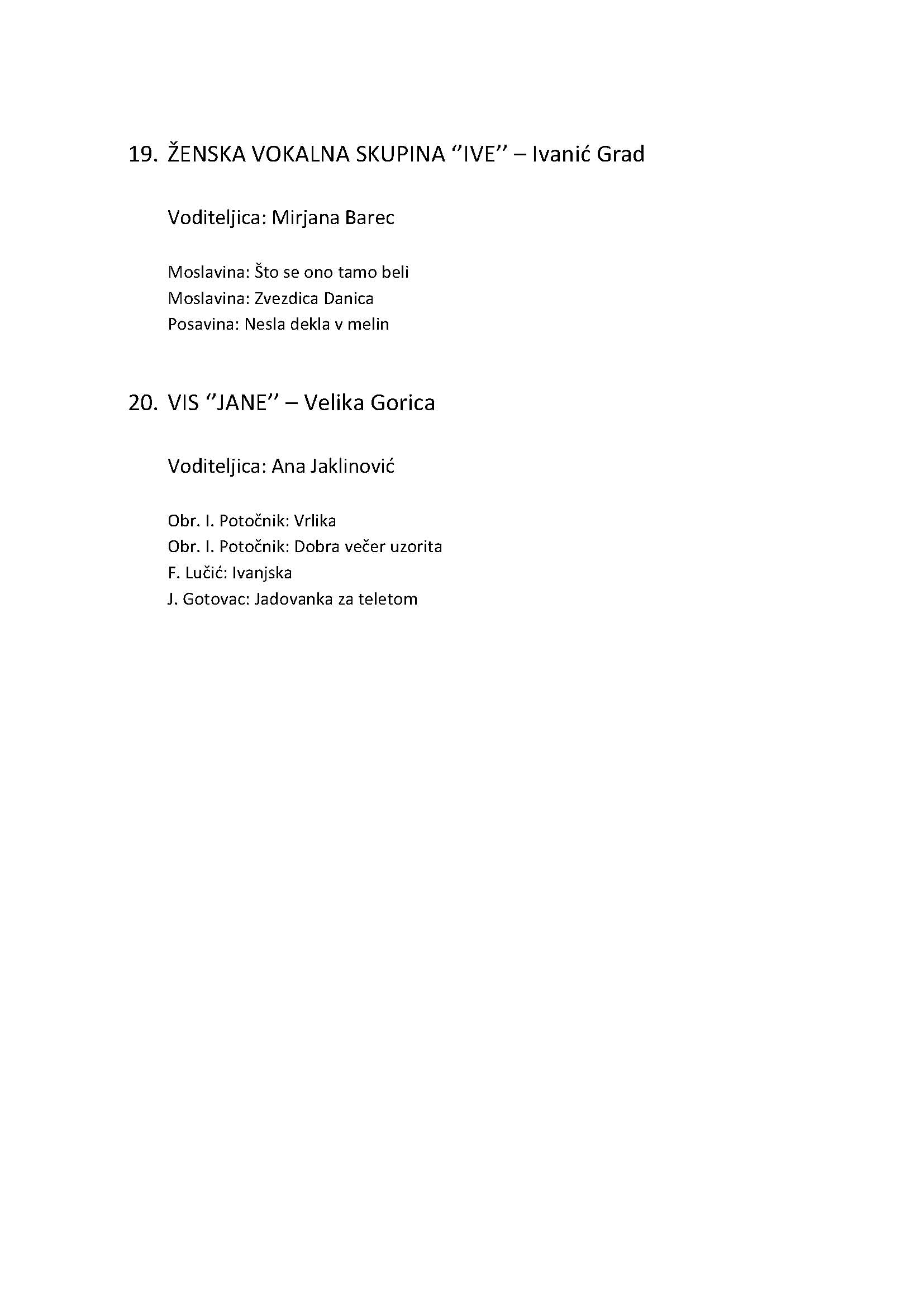 Također, publici će se predstaviti još članovi dugoselskog VA „Duga“ te ženska pjevačka skupina KUD-a „August Cesarec“ Brckovljani. Selektori 18. susreta su Irena Miholić i Robert Homen. Organizatori su HKUD Petar Zrinski Vrbovec, Zajednica kulturno-umjetničkih udruga Zagrebačke županije. Pokrovitelji su Hrvatski sabor kulture, zagrebačka županija, Grad Vrbovec, POU Vrbovec, II. Osnovna škola Vrbovec. Više o događanju te programu u prilogu.