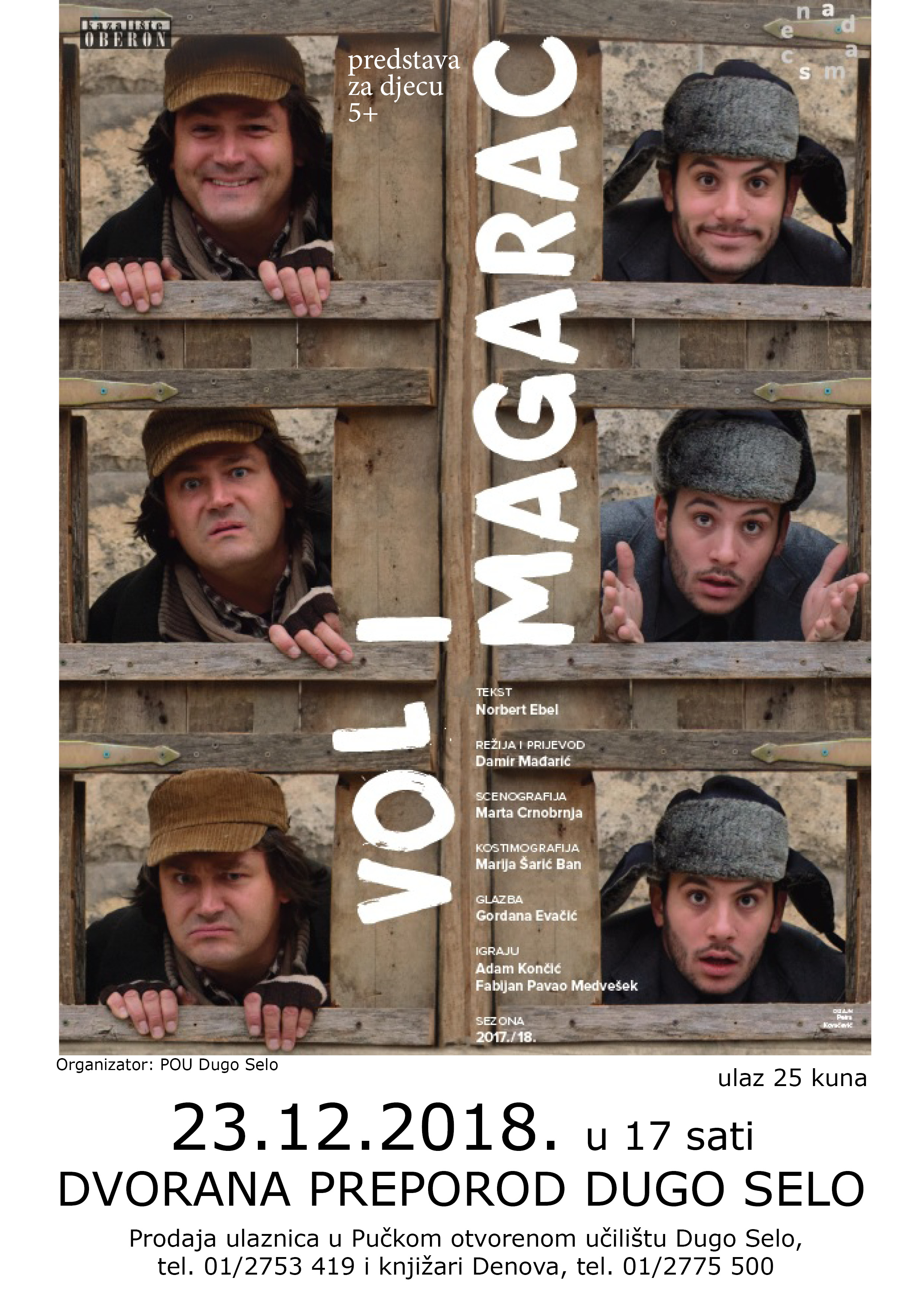 Nagrađivana predstava „Vol i magarac“ održat će se u nedjelju, 23. prosinca, u Dvorani Preporod s početkom u 17 sati, u organizaciji POU-a Dugo Selo. Radi se o neobičnoj božićnoj predstavi za djecu stariju od pet godina, ali i za odrasle. Poznati kazališni komad Norberta Ebela izvodi se u 60-tak kazališta diljem Europi, u Hrvatskoj u produkciji kazališta Oberon i Adam Scene. Vola i Magarca igraju Adam Končić i Fabijan Pavao Medvešek.