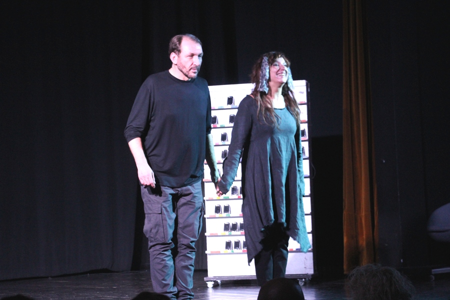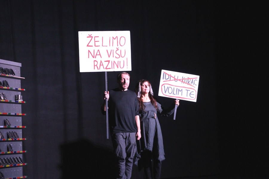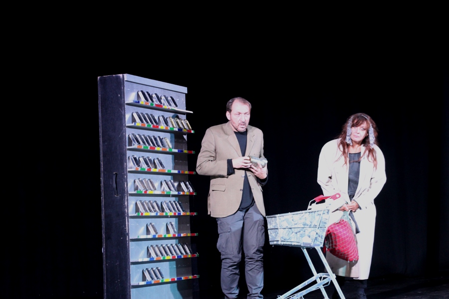 Glavni likovi su ON i ONA, u vrhunskoj izvedbi Marka Torjanca i Gordane Gadžić. Ona je glasna, agresivna, potpuno rastrojena, nezaposlena. Iako On svoj MTP tip osobnosti (miran, tih, povučen) pokušava održati, daje dojam umjereno rastrojenog čovjeka. Oboje su nesretni, frustrirani životnim neuspjesima, egzistencijalnim problemima, nemogućnosti nalaženja mjesta pod Suncem, neostvarenim snovima, nesnalaženju po društvenom predlošku. Takvi očajni, susreću se trgovini pored police s konzervama i ne mogu riješiti naoko banalan problem – pristup tim konzervama. Ona ga udara i viče, a cijeli događaj odmah na početku prepričava publici tražeći odobravanje svog čina pa predstava postaje interaktivna.