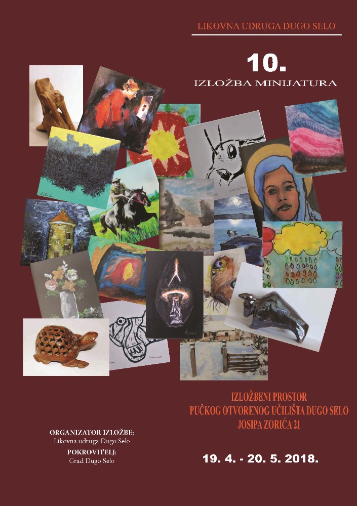 Jubilarna, 10. izložba Likovne udruge Dugo Selo Minijatura-svijet u malom otvorit će se 19. travnja u dvorani Pučkog otvorenog učilišta Dugo Selo, J.Zorića 21 a, s početkom u 19 sati.