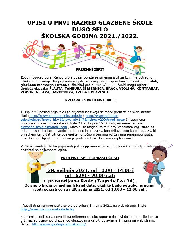 Upisi u prvi razred Glazbene škole Dugo Selo