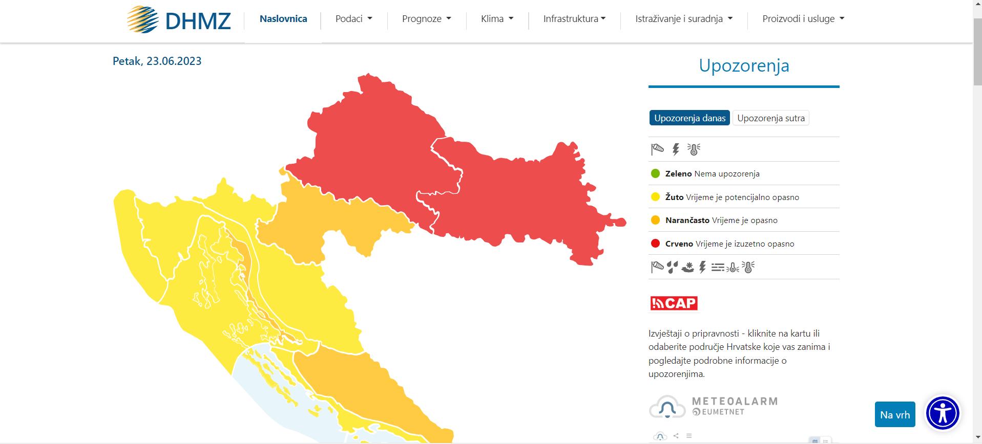 Vlada toplinski val, maksimalna temperatura danas ide na više od 33 °C dok je minimalna temperatura > 20 °C, upozorava DHMZ za Zagrebačku regiju. BUDITE NA OPREZU zbog vrućina. Mogući su zdravstveni rizici među osjetljivom populacijom, ponajprije kod starijih i kod male djece. Stupanj pripravnosti je u žutom.