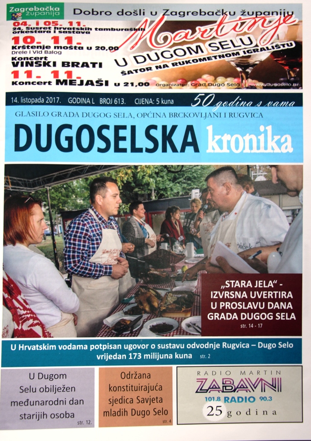 Izašao je novi broj Dugoselske kronike. U 613. broju donosimo događanja s područja Dugog Sela, Rugvice i Brckovljana. U Hrvatskim vodama potpisan je ugovor za sustav odvodnje aglomeracija Rugvica-Dugo Selo vrijedan 173 milijuna kuna. Održana su tradicionalna „Stara jela z Dugoga Sela“ donosimo reportažu o ovoj izuzetno posjećenoj manifestaciji, izvrsnoj uvertiri u proslavu Dana grada.
