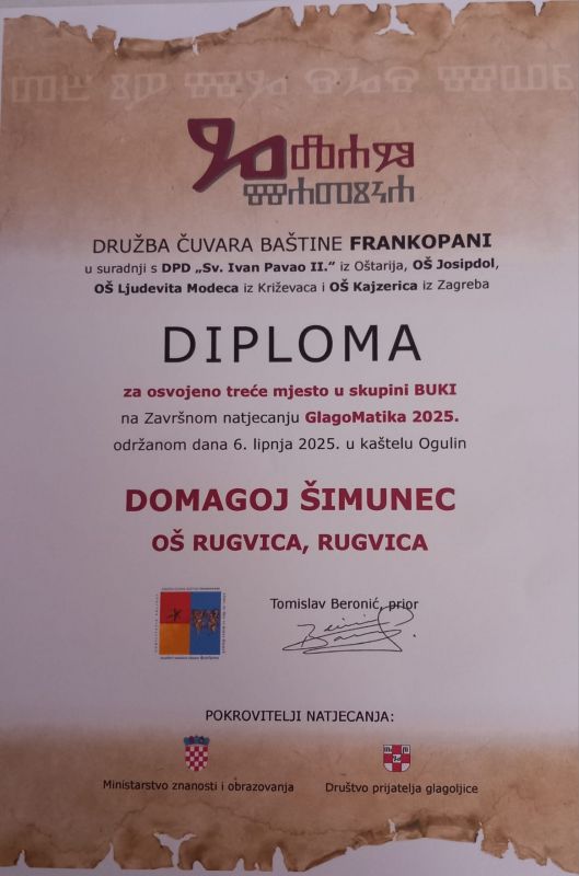 Domagoj je tijekom cijele školske godine s velikim zanimanjem i predanošću sudjelovao u kvalifikacijskim kolima natjecanja, a u finalu je pokazao iznimno znanje, brzinu i snalažljivost. GlagoMatika je online natjecanje koje se sastoji od dvije igre – Igra brojeva, u kojoj natjecatelji prepoznaju i zbrajaju brojeve pisane glagoljicom, te Igra riječi, gdje se prepoznaju glagoljične riječi iz Misala kneza Anža Frankopana. Iako učenici mogu odabrati samo jednu igru, za ukupni rezultat zbrajaju se bodovi iz obje igre. Završno natjecanje organizirano je pod pokroviteljstvom Ministarstva znanosti, obrazovanja i mladih, a u suradnji s Društvom čuvara baštine "Frankopani". Iza cijele ideje i platforme GlagoMatika stoji neumorni promicatelj glagoljice i autor igre, Tomislav Beronić. Njegova vizija i entuzijazam omogućili su učenicima iz cijele Hrvatske da na zanimljiv i suvremen način uče o našem prvom pismu. Domagoj je za svoj trud i izvrsnost nagrađen prigodnim nagradama organizatora i mnogih sponzora. Njegov uspjeh ne samo da nas čini neizmjerno ponosnima, nego i pokazuje koliko ljubav prema jeziku, pismu i znanju može daleko odvesti. Domagoju, bravo i hvala što si tako dostojno predstavio našu školu!