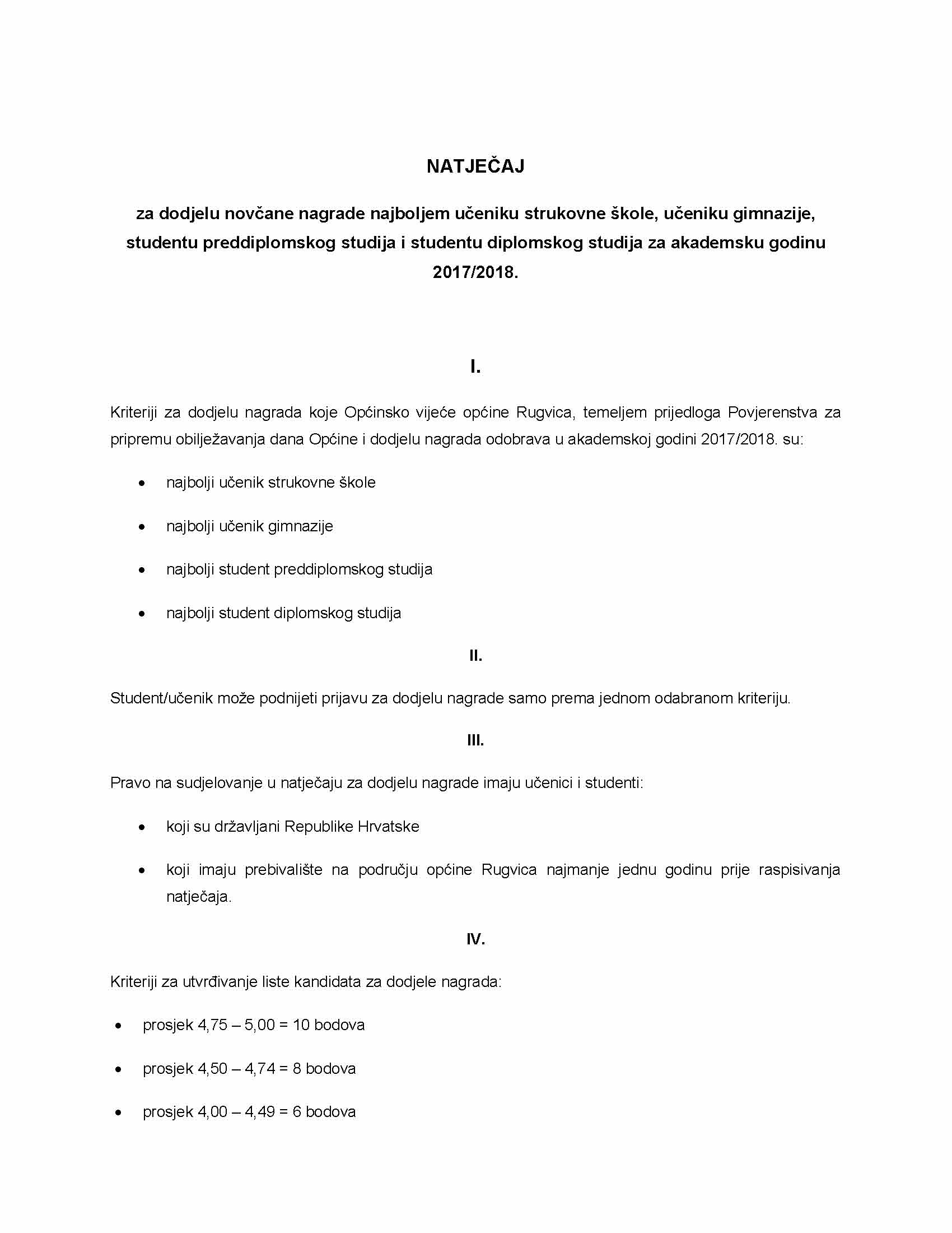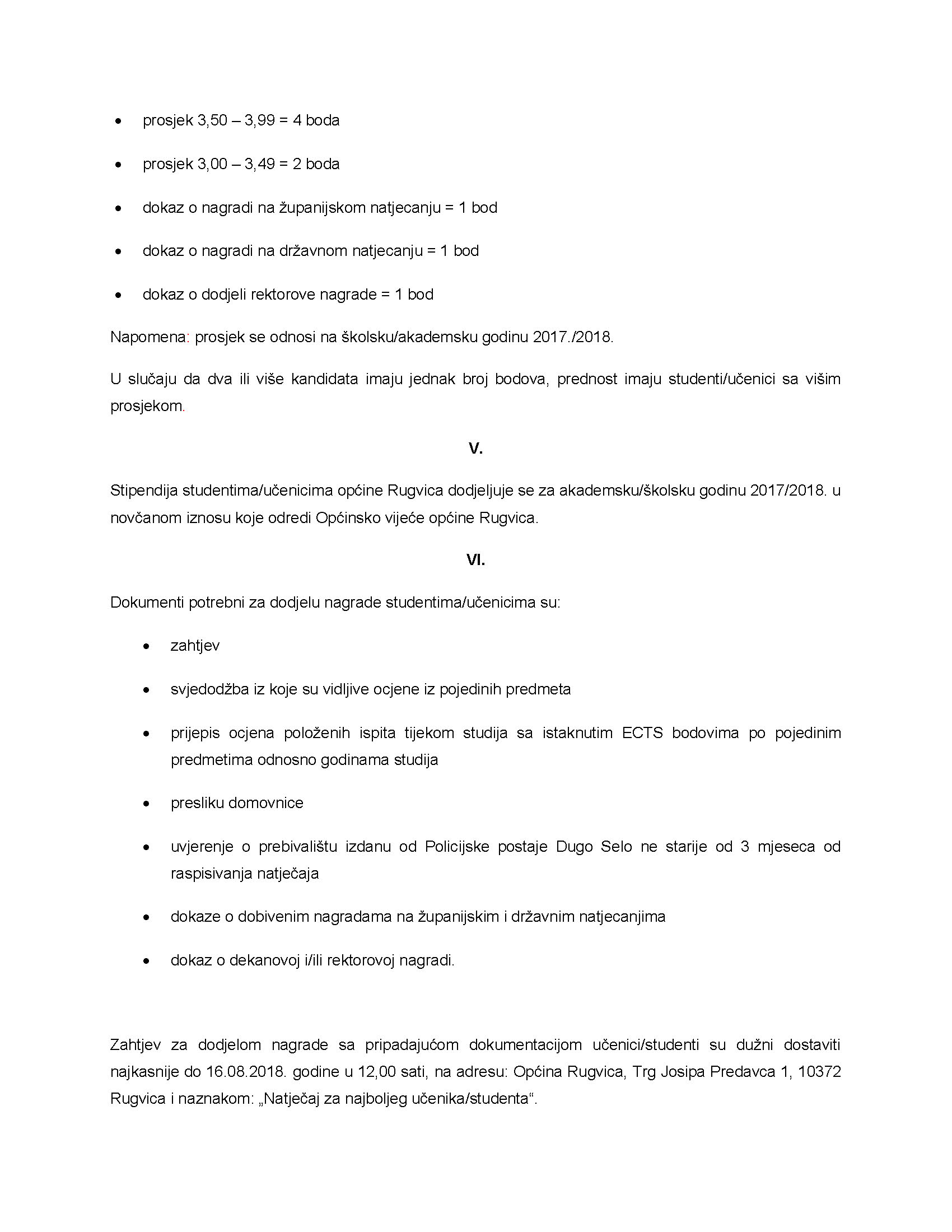 Općina Rugvica raspisala je natječaj za dodjelu novčane nagrade najboljem učeniku strukovne škole, učeniku gimnazije, studentu preddiplomskog studija i studentu diplomskog studija za akademsku godinu 2017./2018.