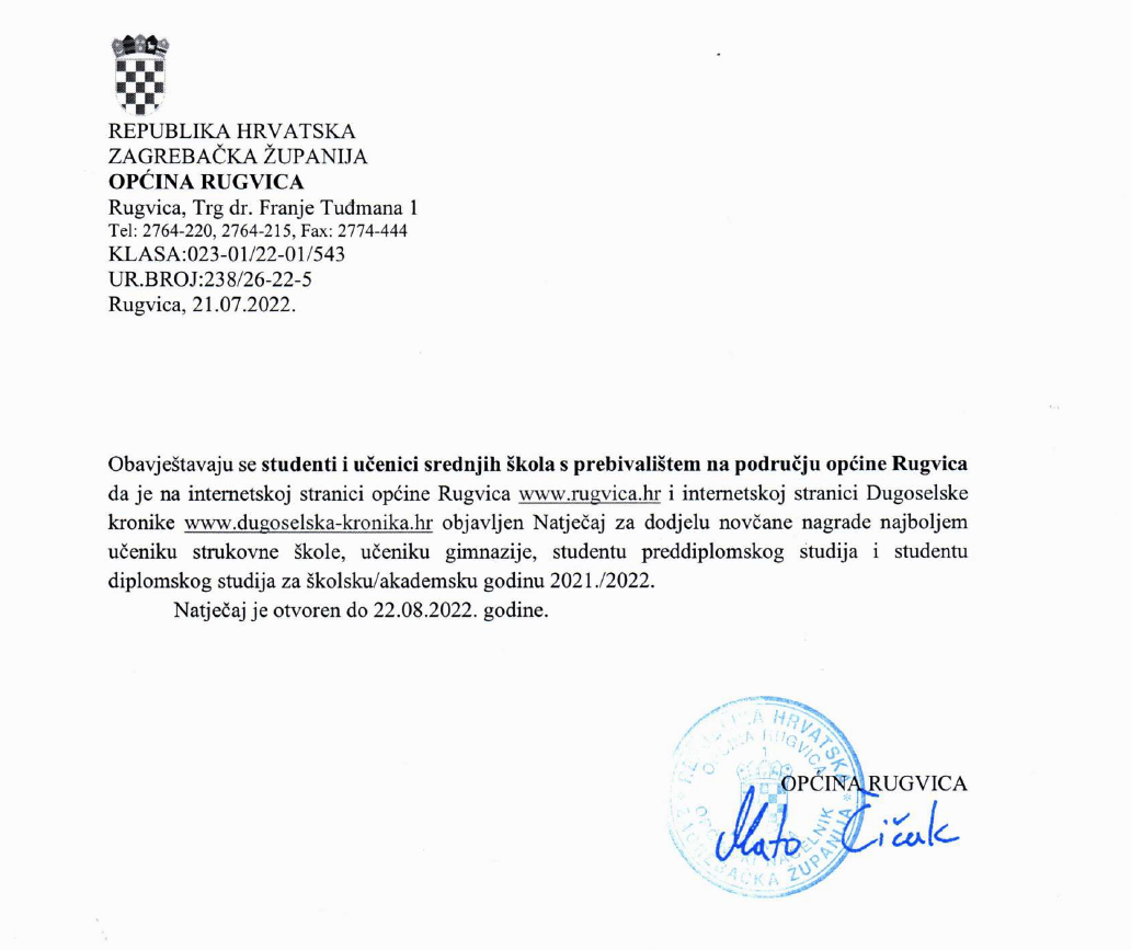 Obavještavaju se studenti i učenici srednjih škola s prebivalištema na području općine Rugvica da je na internetskoj stranici Općine Rugvica www.rugvica.hr i na internetskoj stranici Dugoselske kronike www.dugoselska-kronika.hr objavljen Natječaj za dodjelu novčane nagrade najboljem učeniku strukovne škole, učeniku gimnazije, studentu preddiplomskog studija i studentu diplomskog studija za školsku/akademsku godinu 2021./2022..