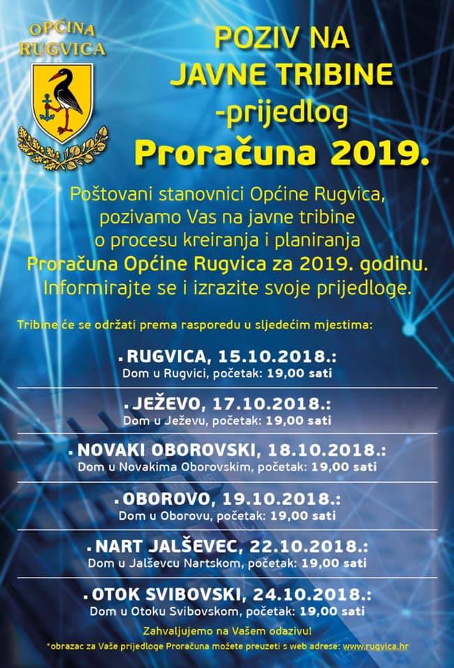 Prva u nizu od njih održat će se večeras u 19 sati u Rugvici u društvenom domu s početkom u 19 sati.U srijedu će se tribina također u 19 sati održati u Ježevu, u četvrtak u Novakima Oborovskim, do će se u petak tribina održati u Oborovu. Za sljedeći tjedan tribine su najavljene u Nartu Jalševskom za ponedjeljak u 19 sati, dok će se u srijedu, 24. listopada u istom terminu održati tribina u Otoku Svibovskom.Obrazac prijedloga proračuna može se preuzeti na web adresi www.rugvica.hr.Također, popunjeni obrazac možete dostaviti na mail adresu Ova e-mail adresa je zaštićena od spambota. Potrebno je omogućiti JavaScript da je vidite. najkasnije do 30. listopada.