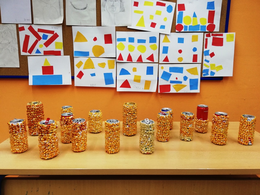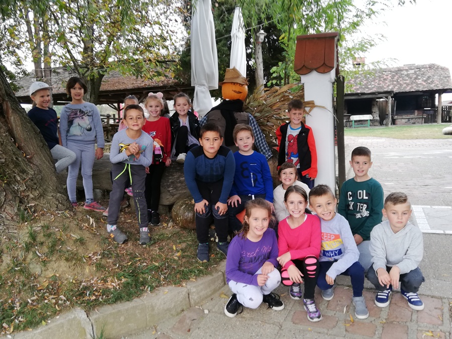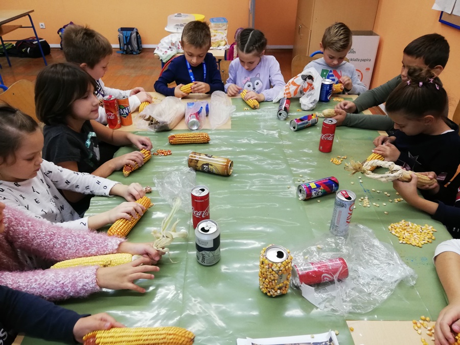 Aktivnošću krunjenja kukuruza prvašići su se okušali u novoj vještini. Zrnca kukuruza poslužila su za izradu držača za olovke. Sredinom listopada održana je izvanučionička nastava u Šumećanima. Učenici su na imanju Kezele skupljali jesenske plodove: jabuke, dunje, žireve te ponijeli kućama otpalo šareno lišće javora, kestena, graba i bukve na prešanje. Fotografirajući se uz ogromne buče i stiliziranog Jesenka prvašići su uživali u jesenskom vremenu u raznim igrama. U radionici izrade kruha učenici su pokazali svoju kreativnost i umješnost u prostornom oblikovanju. Jesensko lišće bilo je motiv dizajniranja kravate za očeve učenika, povodom Dana kravate, u kojoj su dominante bile osnovne boje. Tvrtka BC Institut ugostila je prvi a razredni odjel u svojim prostorijama i na oranicama. Svaki učenik je na oranici „naučeno“ otkinuo nekoliko klipova kukuruza. U tvrtki su tako naučeni sadržaji o berbi kukuruza, kukuruznim proizvodima, soji, pšenici, …Spretnost i vještinu učenici su pokazali i u spremanju jabučnog deserta. No, veliko iznenađenje vidjelo se kod učenika kada su slušali priču Kako je jabuka dobila svoju zvijezdu. Svaki učenik je željno iščekivao je li i njegova donošena jabuka ima zvijezdu. U igri spretnosti i glume učenici su svojim tijelima oblikovali debla jabuke dok su stvarni plodovi činili njihovu bogatu krošnju. Uporabom osnovnih boja učenici su se poigrali jabučnog labirinta te slikovno obogatili crtež. Izniman događaj za učenike bilo je natjecanje paralelnih odjela prvih razreda u krunjenju kukuruza. Događaju su sudjelovale djelatnice tvrtke BC Instituta te drugi razredni odjeli u navijaju i bodrenju. No, veliku podršku dale su i mame pojedinih učenika koje su prisustvovale događaju. Nakon mnogih aktivnosti s kukuruzom više nije bio problem linijom prikazati klip kukuruza. Učenici su se okušali i u plastificiranju te su jesensko lišće koje su ponijeli s izvanučioničke nastave plastificirali i tako za dugo vremena sačuvali. No, jesen bez kišobrana nije prava jesen. Igrajući se kišobranima na kiši, gacajući po lokvicama, pjevajući Jesen je stigla i Na kiši učenici su na zanimljiv način plošno dizajnirali male kišobrane.